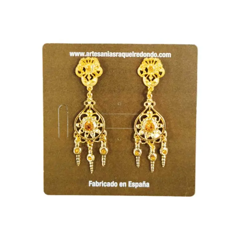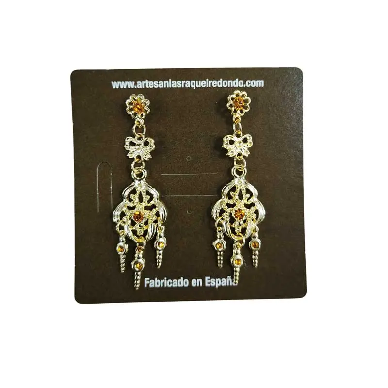 Los pendientes de estilo clásico presentan formas de lágrima, filigranas y adornos que evocan la joyería antigua. Suelen fabricarse en acabados dorados o envejecidos, reflejando la esencia más pura del traje regional.