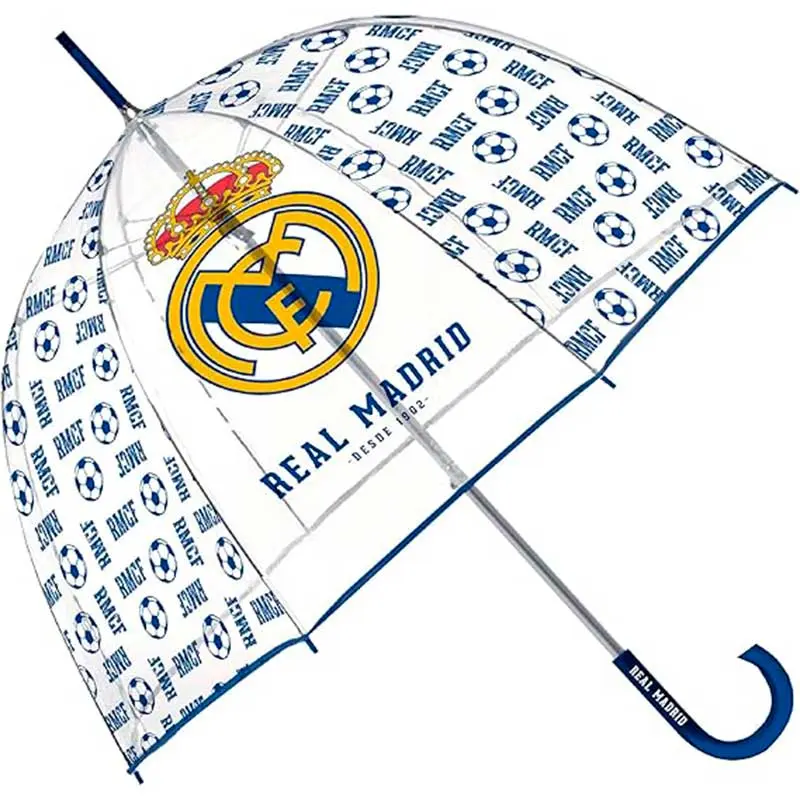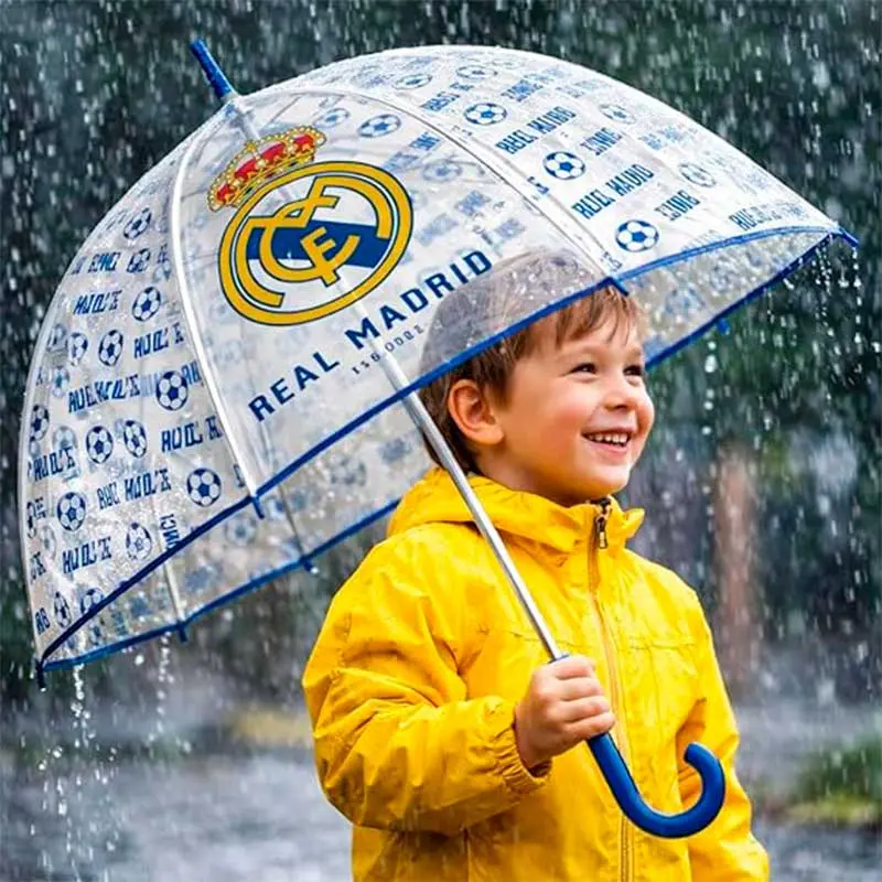El paraguas infantil ARDITEX del Real Madrid combina funcionalidad y diseño para que los niños puedan protegerse de la lluvia con los colores de su equipo favorito. Fabricado en EVA transparente, permite mantener una buena visibilidad del entorno, algo especialmente importante para los más pequeños mientras caminan. Su diseño con forma de burbuja o cúpula ofrece una mayor cobertura frente al viento y las salpicaduras, ayudando a mantener mejor protegidos a los niños en los días de lluvia. Además, incorpora una estructura resistente de 8 paneles que proporciona estabilidad y durabilidad, pensada para el uso diario. El paraguas cuenta con sistema de apertura manual con corredera y topes de seguridad, facilitando un manejo sencillo y seguro para los niños. Gracias a sus medidas adaptadas al público infantil, con 67 cm de diámetro y 69 cm de longitud, es un accesorio práctico y un regalo ideal para pequeños aficionados del Real Madrid. Descubre en Atelier Moda y Hogar un amplio catálogo de paraguas infantiles.